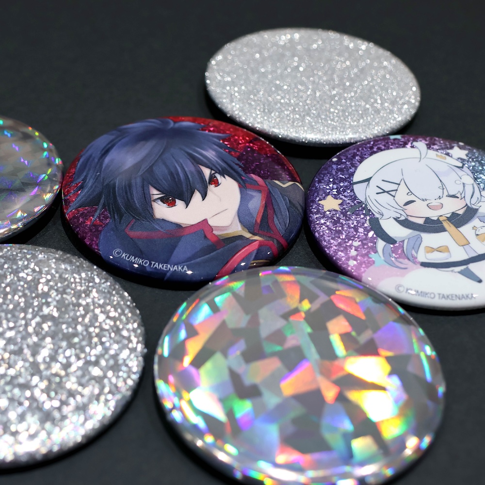 グリッターやホログラム仕様の缶バッジ。