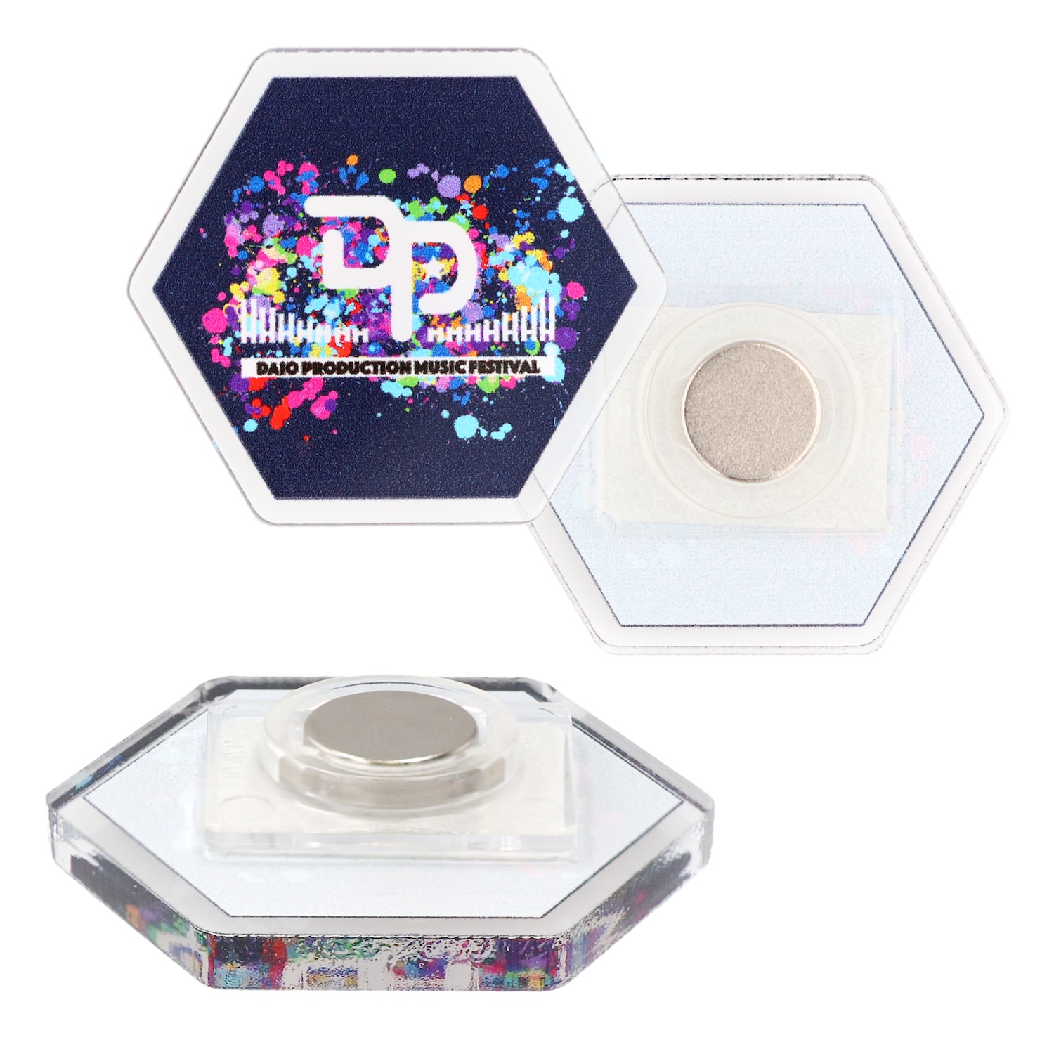 ダイカットのアクリルに強力ネオジウム磁石を貼り合わせたマグネット。