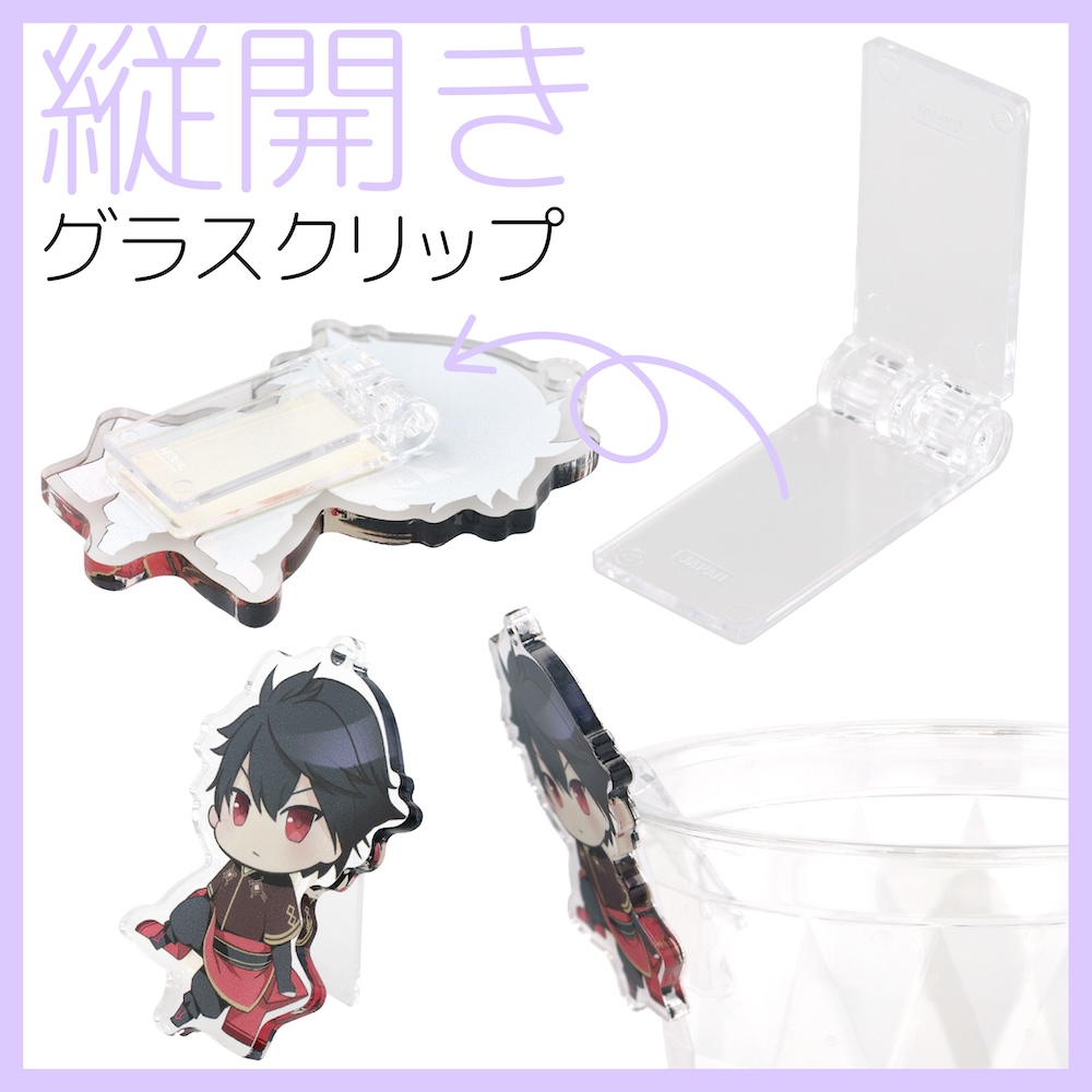 縦開きにして、グラスクリップや折りたためるアクリルスタンドに。