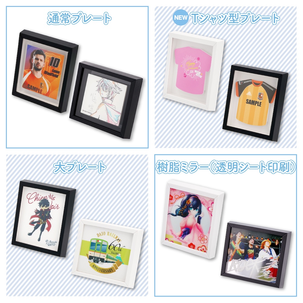 | 本体サイズ | 【ミニ額縁】本体:W52×H60×D10㎜(マグネットシート・スタンドパーツの厚みは含まない)印刷プレート通常サイズ:W35×H40mm印刷プレート大サイズ:W43×H49.5mm印刷プレートTシャツ型:W40×H39mm |